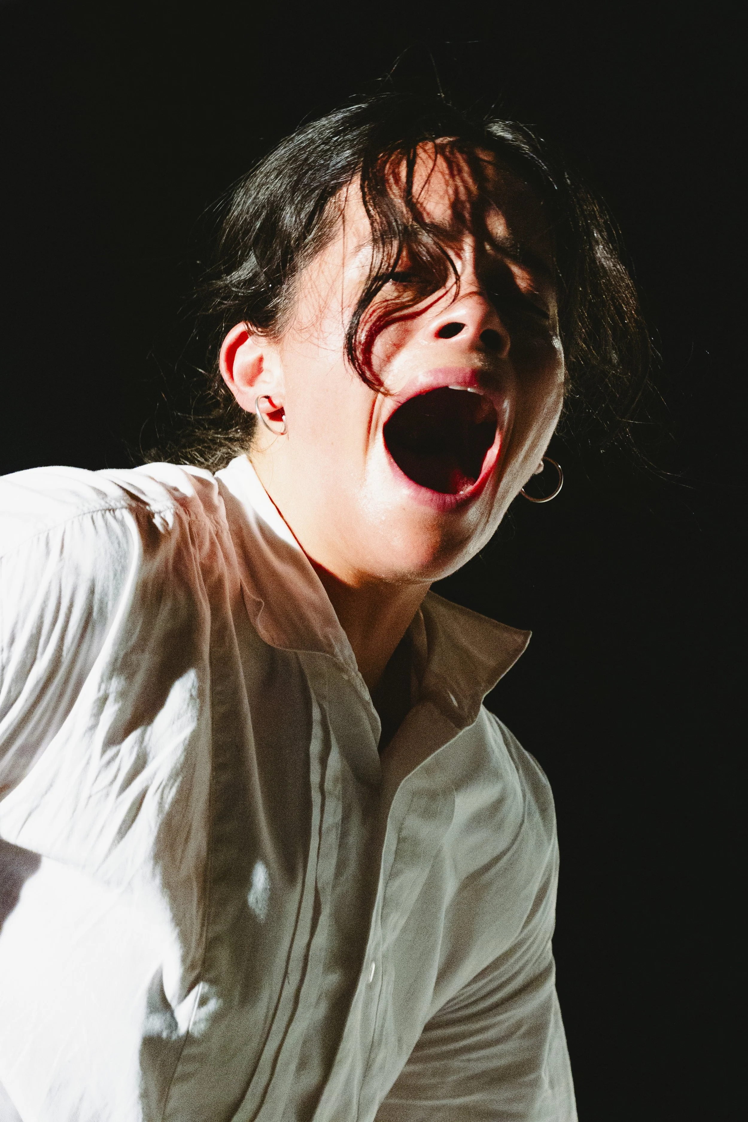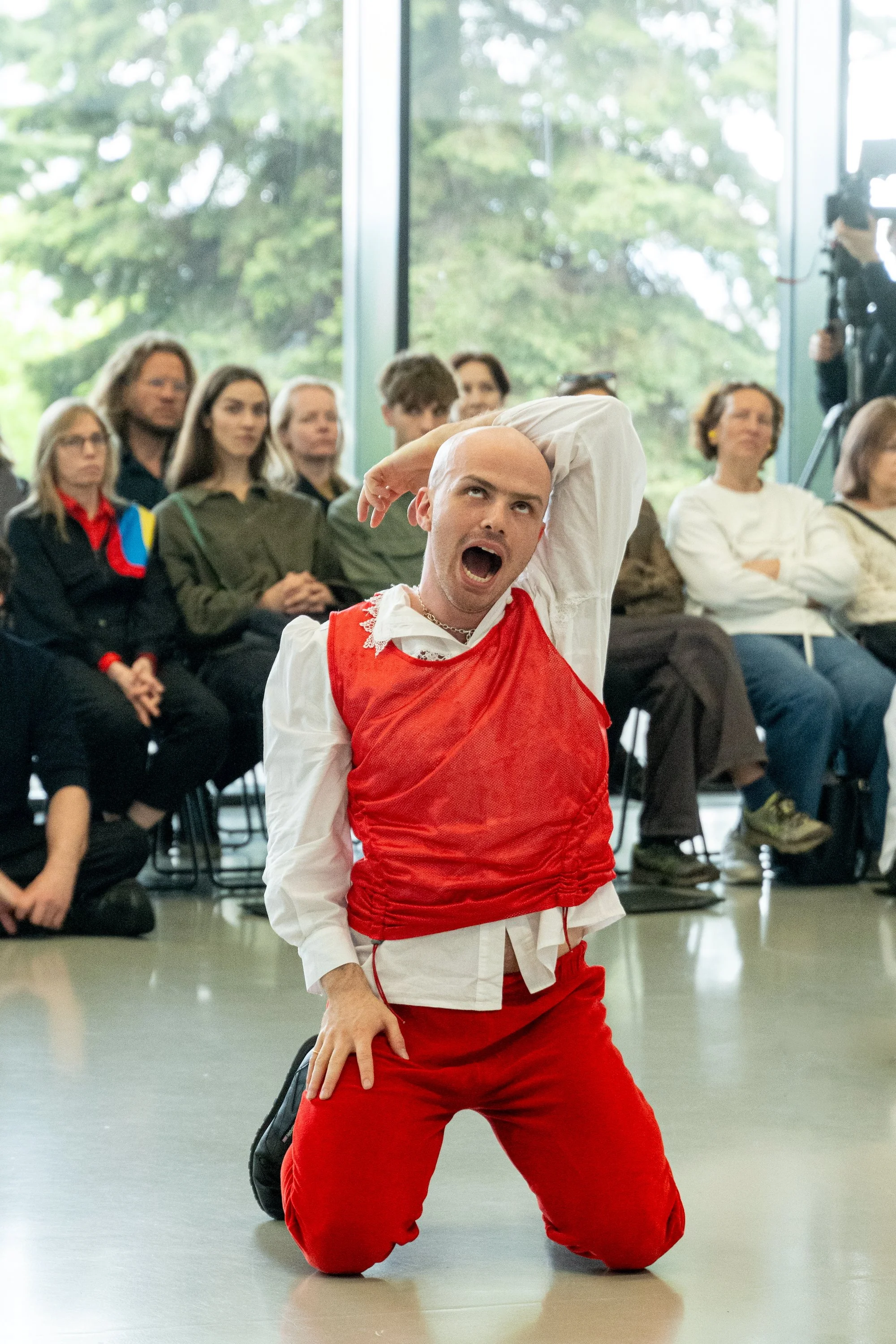 Performance Chiaroscuro is part of an ongoing artistic research by Liza Baliasnaja, exploring how emotions like fear and disgust shape political subjectivity in times of social polarization. The frightened body and its grotesque expressions are the focus of the work. By amplifying fear’s somatic manifestations, the performance leans into the emotional exaggeration characteristic to baroque period paintings. The title refers to the baroque technique chiaroscuro, defined by the strong contrast between light and darkness.